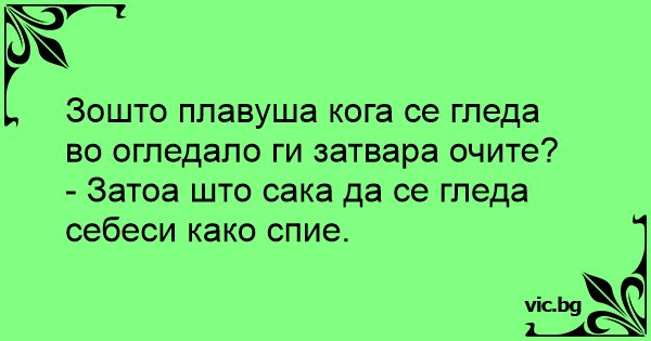 Пред огледало Eine Blondine mit geschlossenen Augen vor einem Spiegel - Защо блондинката стои пред огледалото със затворени очи? Γιατί οι ξανθιές κάθονται μπροστά σε ένα καθρέφτη με κλειστά τα μάτια; Γιατί θέλουν να δουν πώς είναι όταν κοιμούνται! Co robi blondynka z zamkniętymi oczami przed lustrem? - Chce zobaczyć, jak wygląda kiedy śpi. Why did the blonde stand in front of the mirror with her eyes closed? She wanted to see what she looked like asleep. Hvorfor stod blondinen foran spejlet med lukkede øjne? - Hun ville se hvordan hun så ud når hun sov Blondi seisoi silmät kiinni peilin edessä. Aviomies kysyi syytä tähän. - Haluan nähdä miltä näytän nukkuessani! Hørt om svensken som stod med lukkede Øyne foran speilet for å se hvordan han så ut når han Sov? Maarit till Harald: - Varför tittar du dej i spegeln med stängda ögon? - Jag tittar efter hur jag ser ut när jag sover! Visa svaret Svar: Aynanın karşısında gözleri kapalı duran Temel'e ne yaptığını sormuşlar. Uyurçen sanıl çöründüğümü merak ettum.