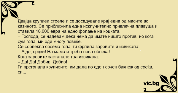Згодна надарена плавуша влегува во казино, вади 10.000 евра и им вели на мажите околу масата: - Се надевам дека нема да ви смета ако се соблечам гола, така имам повеќе среќа. Мажите се согласиле, таа се соблекла, ги фрлила коцките и вели: - Ајде коцкички, ајде, ми требаат нови алишта. Коцките...