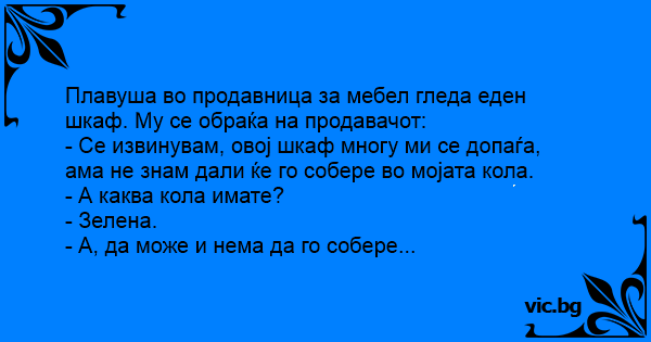 - Се извинувам, овој шкаф многу ми се допаѓа, ама не знам дали ќе го собере во мојата кола.