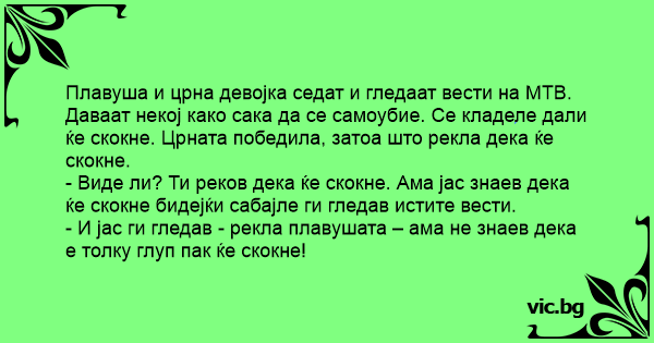 Плавуша и црна девојка седат и гледаат вести на МТВ. Даваат некој како сака да се самоубие. Се кладеле дали ќе скокне. Црната победила, затоа што рекла дека ќе скокне.