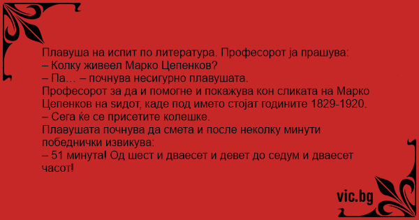 Професорот за да и помогне и покажува кон сликата на Марко Цепенков на ѕидот, каде под името стојат годините 1829-1920.
