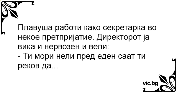 Плавуша работи како секретарка во некое претпријатие. Директорот ја вика и нервозен и вели: