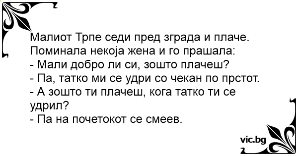 Малиот Трпе седи пред зграда и плаче. Поминала некоја жена и го прашала: