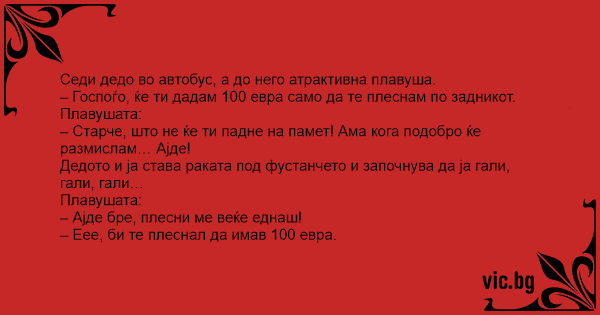 – Госпоѓо, ќе ти дадам 100 евра само да те плеснам по задникот.