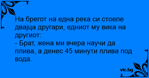 - Брат, жена ми вчера научи да плива, а денес 45 минути плива под вода.