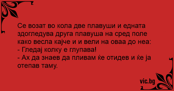 Се возат во кола две плавуши и едната здогледува друга плавуша на сред поле како весла кајче и и вели на оваа до неа: