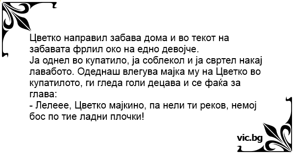 Ја однел во купатило, ја соблекол и ја свртел накај лавабото. Одеднаш влегува мајка му на Цветко во купатилото, ги гледа голи децава и се фаќа за глава: