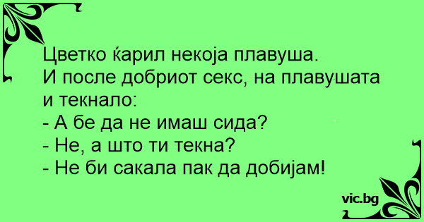 После непреспана ноќ, плавушата го прашува партнерот: - Извини заборавив вчера да те прашам, да не имаш СИДА случајно? Не, и одговара тој, а што ти текна баш на сега на тоа? - Онака, само што ја прележав , па да не фатам пак!