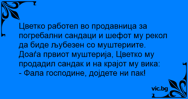 Цветко работел во продавница за погребални сандаци и шефот му рекол да биде љубезен со муштериите.