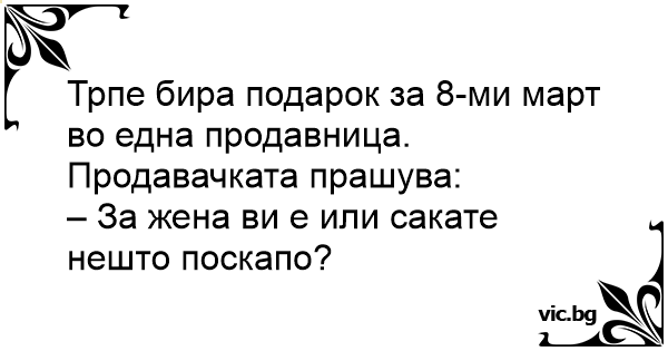 Трпе бира подарок за 8-ми март во една продавница. Продавачката прашува: