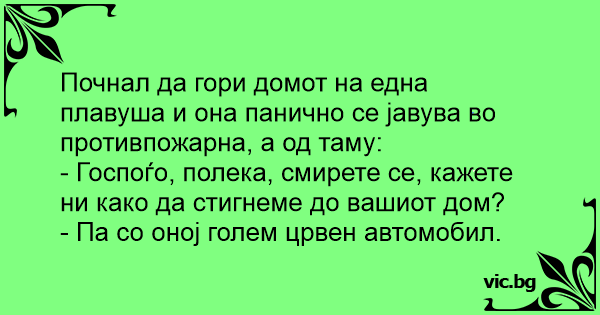 Блондинка предизвиква пожар в къщата си и звъни на пожарната. От там и отговарят: