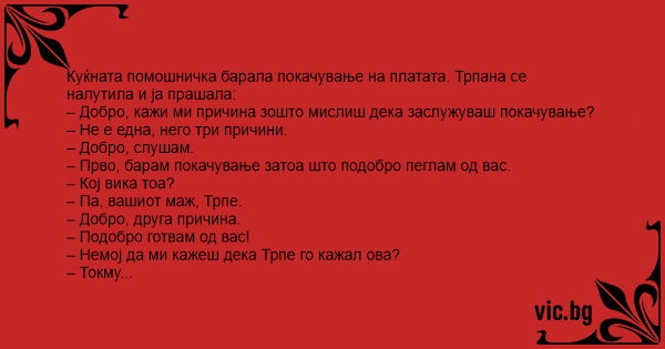 Домашната помошничка побарала зголемување на платата. Газдарицата многу се налутила и ја прашала: Па добро Марија, кажи ми ја причината зошто мислиш дека заслужуваш зголемување на платата? Марија...