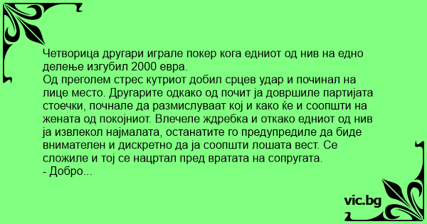 Од преголем стрес кутриот добил срцев удар и починал на лице место. Другарите одкако од почит ја довршиле партијата стоечки, почнале да размислуваат кој и како ќе и соопшти на жената од покојниот. Влечеле ждребка и откако едниот од нив ја извлекол најмалата, останатите го предупредиле да биде внимателен и дискретно да ја соопшти лошата вест. Се сложиле и тој се нацртал пред вратата на сопругата.