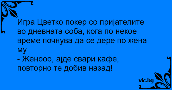 Игра Цветко покер со пријателите во дневната соба, кога по некое време почнува да се дере по жена му.