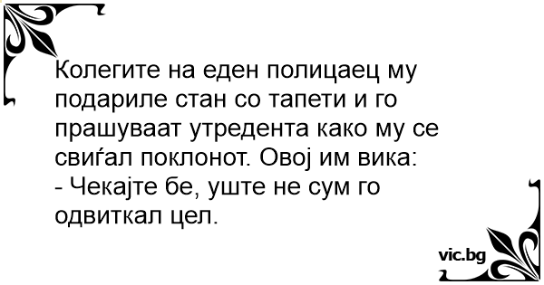 Колегите на еден полицаец му подариле стан со тапети и го прашуваат утредента како му се свиѓал поклонот. Овој им вика: