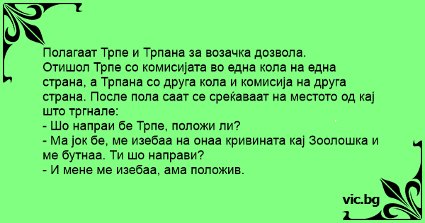 Отишол Трпе со комисијата во една кола на една страна, а Трпана со друга кола и комисија на друга страна. После пола саат се среќаваат на местото од кај што тргнале: