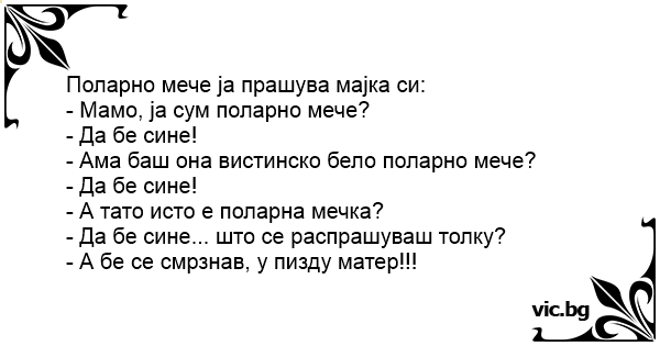A kis jegesmedve kérdezi az anyukájától: - Anyu, én jegesmedve vagyok? - Igen, kisfiam, te jegesmedve vagy. - És te is és apu is jegesmedvék vagytok? - Igen, kisfiam. - És a nagymami és a nagypapi...