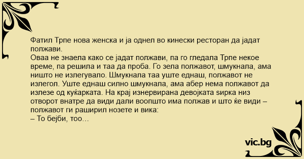 Фатил Трпе нова женска и ја однел во кинески ресторан да јадат полжави.