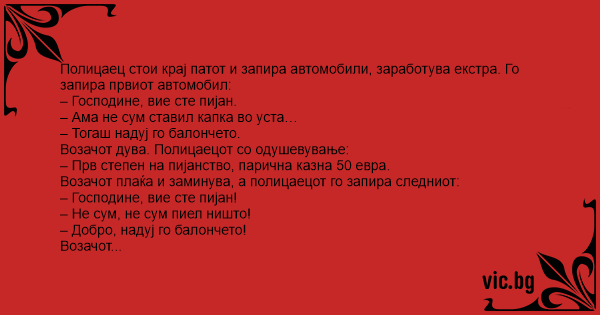 Полицаец стои крај патот и запира автомобили, заработува екстра. Го запира првиот автомобил: