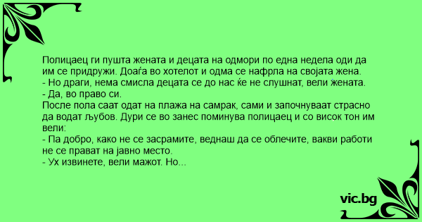 - Добро колега, вас ќе ви простам овој пат. Но на оваа ороспија не, ќе плати казна, ова и е веќе трет пат оваа недела да ја фатам на cekc на плажа!!!