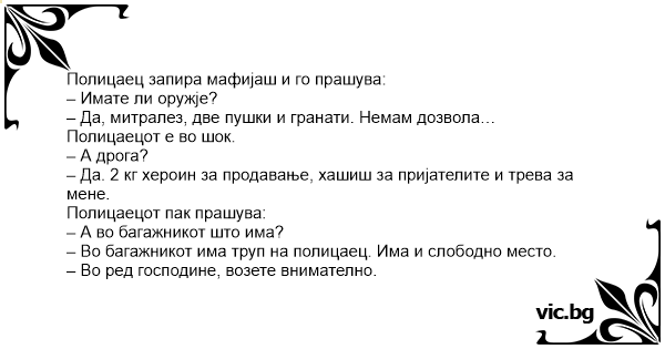 – Во багажникот има труп на полицаец. Има и слободно место.