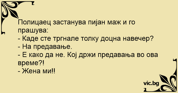 Полицай спира забързан минувач в 3 часа през нощта. След полунощ полицай спира шофьор, превишил скоростта. Ein Mann wird um Mitternacht von der Polizei angehalten und gefragt, wohin er geht. Полиция останавливает мужчину в нетрезвом состоянии в час ночи. The police stop an old guy in questionable condition at 1 am. Пиян мъж върви по улицата. Среща го полицай: - Къде си тръгнал, не се ли виждаш колко си пиян?- пита последният. - На лекция за вредата от алкохола- отговаря пияният. - Каква лекция? Я, погледни, 3 през нощта е! Кой луд чете лекции по това време?! - Жената и тъщата... Ein Autofahrer wird nachts von der Polizei angehalten: "Wohin fahren Sie?" - "Zu einem Vortrag über Alkoholmissbrauch und Rauchen." - "Wer hält um diese Uhrzeit solche Vorträge?" - "Mein Frau!" A dokąd to obywatelu? - pyta policjant pijanego. - Idę wysłuchać kazania. - A kto wygłasza kazania o trzeciej w nocy?! - Moja żona. The man was in no shape to drive, so he wisely left his car parked and walked home. As he was walking unsteadily along, he was stopped by a policeman. "What are you doing out here at 2 A.M.?" asked... An elderly man is stopped by the police around 2 a.m. and is asked wherehe is going at this time of night. The man replies, "I am on my way to a lecture about alcohol abuse and theeffects it has on... Een dronken man besluit heel wijs zijn auto te laten staan en lopend naar huis te gaan. Als hij na een half uur zwalken over straat ineens word aangehouden door een agent. ‘Waar gaat U naar toe om... П'яний чоловік вночі йде по вулиці. Його зупиняє поліцейський: — Куди йдеш? — Іду слухати лекцію про шкоду алкоголізму. — О третій годині ночі?! Хто ж тобі буде її читати? — Моя дружина і теща! Запира полицаец возач во 4 сабајле и му вика: - Каде одиш? - На предавање. - На какво предавање? - На предавање за морални вредности, колку алкохолот штетно влијае врз човечкиот организам, колку... Sustabdė naktį policininkas girtą žmogelį ir klausia: - Pilieti, kur taip skuodi vidury nakties? - Į paskaitą, pareigūne. - Ką čia nusišneki... Kas skaito paskaitas tokiu metu? - Mano žmona,... Un homme âgé est arrêté par la police vers 2 heures du matin et on lui demande où il va à cette heure de la nuit. L’homme répond: - « Je suis en route pour une conférence sur l’abus d’alcool et les... A man is staggering home drunk late at night when he’s stopped by a policeman. ‘What are you doing out here at this time of night?’ asks the officer. ‘I’m going to a lecture,’ replies the man. ‘And... I was stopped by the police at midnight and asked where I was going. Im on the way to listen to a lecture about the effects of alcohol and drug abuse on the human body. The policeman asks, Really?... Een oudere man wordt om 2 uur ’s nachts door de politie staande gehouden en wordt gevraagd waar hij om deze tijd naar toe gaat. Hij antwoordt: “Ik ben op weg naar een lezing over misbruik van...