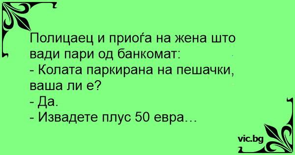 Млада жена чака на опашка пред банкомат. Полицай идва при нея и я пита: „Червената кола на пешеходната пътека ваша ли е?“ „Да, защо? ” “Изтеглете 100 лева повече, моля”