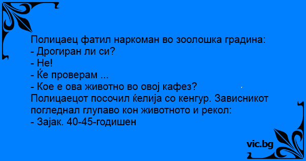Полицай хваща наркоман в зоологическата градина и го пита: