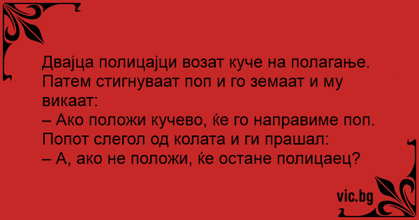 Двајца полицајци возат куче на полагање. Патем стигнуваат поп и го земаат и му викаат: