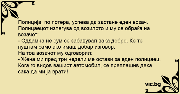 - Жена ми пред три недели ме остави за еден полицаец. Кога го видов вашиот автомобил, се преплашив дека сака да ми ја врати!