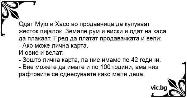 Одат Мујо и Хасо во продавница да купуваат жесток пијалок. Земале рум и виски и одат на каса да плакаат. Пред да платат продавачката и вели: