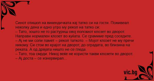 – Ај не ми соли памет – рекол таткото. – Мојот клозет не му пречи никому. Си стои во крајот на дворот, до оградата, во близина на реката. А од дрвјата ништо не се гледа.