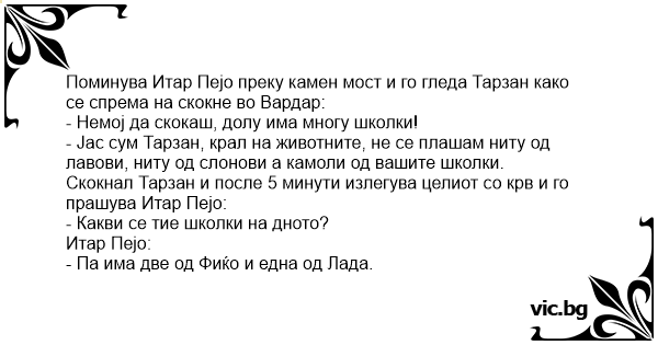 Поминува Итар Пејо преку камен мост и го гледа Тарзан како се спрема на скокне во Вардар: