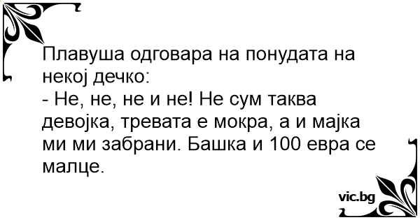 - Не, не, не и не! Не сум таква девојка, тревата е мокра, а и мајка ми ми забрани. Башка и 100 евра се малце.