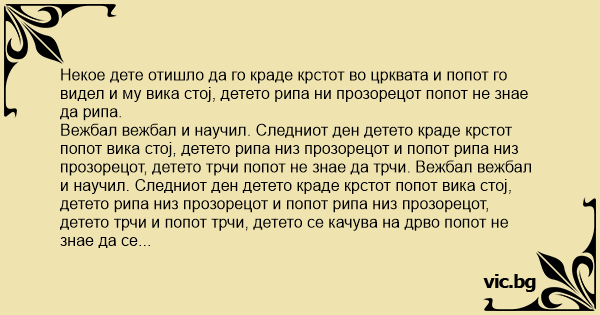 Вежбал вежбал и научил. Следниот ден детето краде крстот попот вика стој, детето рипа низ прозорецот и попот рипа низ прозорецот, детето трчи попот не знае да трчи. Вежбал вежбал и научил. Следниот ден детето краде крстот попот вика стој, детето рипа низ прозорецот и попот рипа низ прозорецот, детето трчи и попот трчи, детето се качува на дрво попот не знае да се качи. Вежбач вежбал и научил. Следниот ден детето краде крстот попот вика стој, детето рипа низ прозорецот и попот рипа низ прозорецот, детето трчи и попот трчи, детето се качува на дрвото и попот се качува на дрвото, детето слегнало од дрвото попот не знаел да слегне. Вежбал вежбал и научил. Следниот ден детето краде крстот попот вика стој, детето рипа низ прозорецот и попот рипа низ прозорецот, детето трчи и попот трчи, детето се качува на дрвото и попот се качува на дрвото, детето слегнало од дрвото и попот слегнал од дрвото, детето рипа во реката попот не знае да рипне. Вежбал вежбал о научил. Следниот ден детето краде крстот попот вика стој, детето рипа низ прозорецот и попот рипа низ прозорецот, детето трчи и попот трчи, детето се качува на дрвото и попот се качува на дрвото, детето слегнало од дрвото и попот слегнал од дрвото, детето рипа во реката и попот рипа во реката, детето почнало да плива попот не знаел да плива. Вежбал вежбал и научил.Следниот ден детето краде крстот попот вика стој, детето рипа низ прозорецот и попот рипа низ прозорецот, детето трчи и попот трчи, детето се качува на дрвото и попот се качува на дрвото, детето слегнало од дрвото и попот слегнал од дрвото, детето рипа во реката и попот рипа во реката, детето почнало да плива и попот почнал да плива, детето излегло од реката попот не знаел да излезе. Вежбал вежбал и научил.Следниот ден детето краде крстот попот вика стој, детето рипа низ прозорецот и попот рипа низ прозорецот, детето трчи и попот трчи, детето се качува на дрвото и попот се качува на дрвото, детето слегнало од дрвото и попот слегнал од дрвото, детето рипа во реката и попот рипа во реката, детето почнало да плива и попот почнал да плива, детето излегло од реката и попот излегол од реката и го фатил.- Е ај сега кажи зошто толку време го крадеше крстот?
