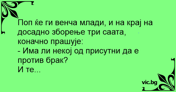 Поп ќе ги венча млади, и на крај на досадно зборење три саата, коначно прашује: