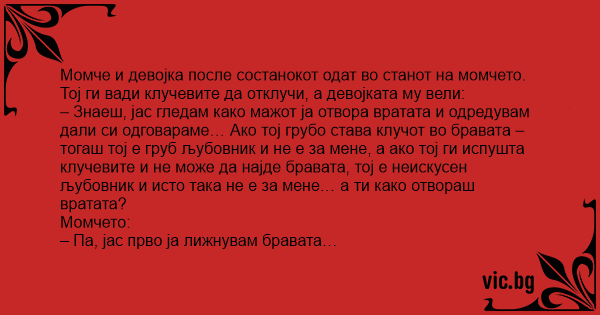 – Знаеш, јас гледам како мажот ја отвора вратата и одредувам дали си одговараме… Ако тој грубо става клучот во бравата – тогаш тој е груб љубовник и не е за мене, а ако тој ги испушта клучевите и не може да најде бравата, тој е неискусен љубовник и исто така не е за мене… а ти како отвораш вратата?