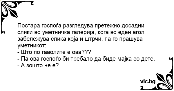Постара госпоѓа разгледува претежно досадни слики во уметничка галерија, кога во еден агол забележува слика која и штрчи, па го прашува уметникот: