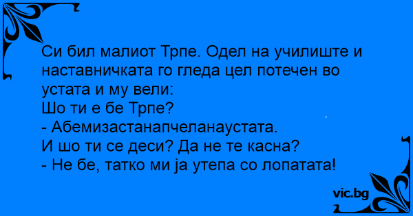 Отива Иванчо на училище с подута и насинена буза. Учителката го пита: