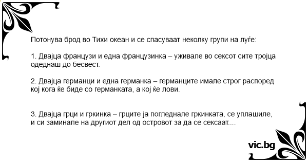 3. Двајца грци и гркинка – грците ја погледнале гркинката, се уплашиле, и си заминале на другиот дел од островот за да се сексаат.