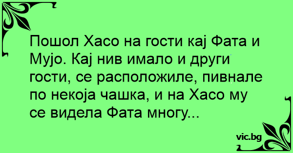 Пошол Хасо на гости кај Фата и Мујо. Кај нив имало и други гости, се расположиле, пивнале по некоја чашка, и на Хасо му се видела Фата многу...