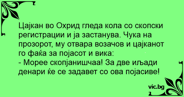Цајкан во Охрид гледа кола со скопски регистрации и ја застанува. Чуka на прозорот, му отвара возачов и цајканот го фаќа за појасот и вика: