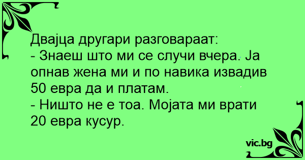 - Знаеш што ми се случи вчера. Ја опнав жена ми и по навика извадив 50 евра да и платам.