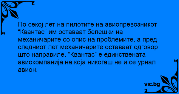 По секој лет на пилотите на авиопревозникот “Квантас” им оставаат белешки на механичарите со опис на проблемите, а пред следниот лет механичарите оставаат одговор што направиле. “Квантас” е единствената авиокомпанија на која никогаш не и се урнал авион.