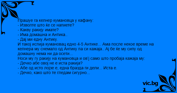 И такој испија кумановац едно 4-5 Антике... Ама после некое време на келнера му снемало од Антику па си кажаја.. Ај бе ќе му сипу од домашну нема ни да осети...