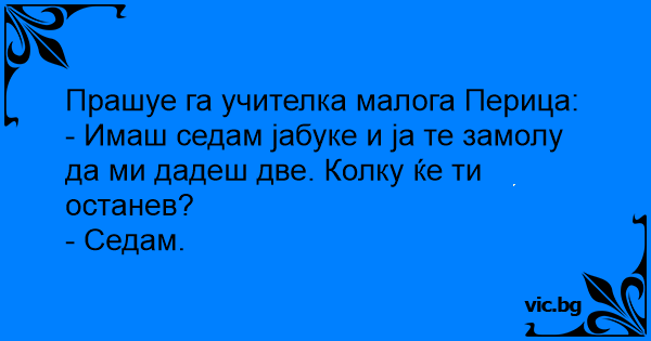 - Имаш седам јабуке и ја те замолу да ми дадеш две. Колку ќе ти останев?