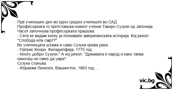 Nauczycielka przedstawia nowego ucznia w Amerykańskiej klasie: - To jest Sakiro Suzuki z Japonii Lekcja się zaczyna. Nauczycielka mówi: - Dobrze, zobaczymy jak sobie radzicie z historią. Kto mi...