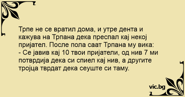 Трпе не се вратил дома, и утре дента и кажува на Трпана дека преспал кај некој пријател. После пола саат Трпана му вика: