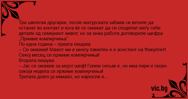 – Извинете, но немав време. Дали слушнавте – се омажив со Пеце од нашиот клас. Уште студираме. Понекогаш одиме и на предавања, бидејќи и двајцата толку многу сакаме компирчиња и по цел ден само компирчиња пржиме! Бидејќи ни се превкусни, Пеце редовно ја лиже тавата, а јас рачката.