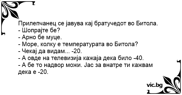 - А бе то надвор можи. Јас за внатре ти кажвам дека е -20.